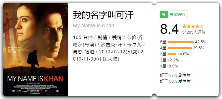 《我的名字叫可汗》是由沙鲁克·罕,卡卓尔等主演的一部印度悲情爱情片,2010年上映。讲述了患轻度自闭症的男主角可汗,在母亲去世后来到美国,认识了美丽的单亲妈妈曼迪娅并结婚的故事。