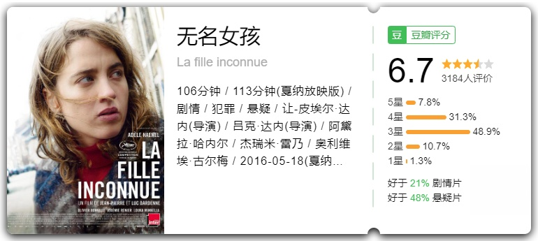 《无名女孩》是由阿黛拉·哈内尔、杰瑞米·雷乃、奥利弗·古尔迈主演的一部剧情悬疑片,2016年上映。讲述了年轻女医生杰妮探寻黑人妓女死亡真相的故事。