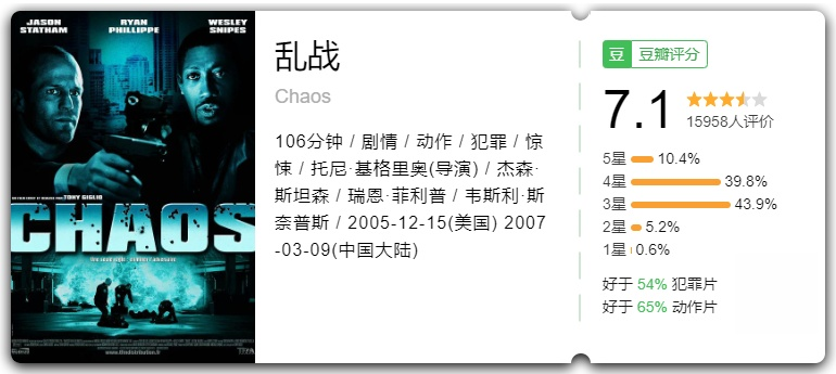 《乱战》是由杰森·斯坦森、瑞恩·菲利普、韦斯利·斯奈普斯等主演的一部犯罪动作片,2005年上映。讲述了5名歹徒闯入银行劫持40名人质,随后警匪双方展开了一场充满阴谋的战斗的故事。