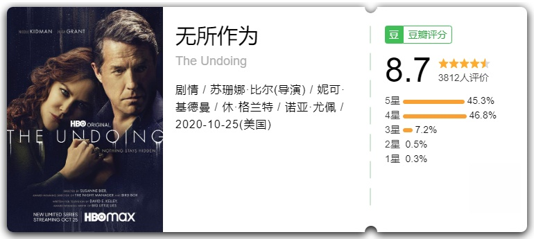 妮可·基德曼和休·格兰特主演的剧,也不知道还有没有人在追,没人看的话我以后就不推它了,个人觉得还行。
