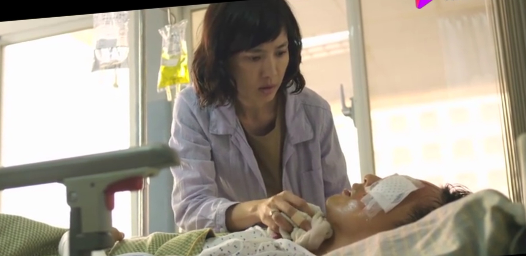 玲子见症马上跑过去扶正架子,她想给男子喂点水,却不小心将水洒倒在男子脖子上。