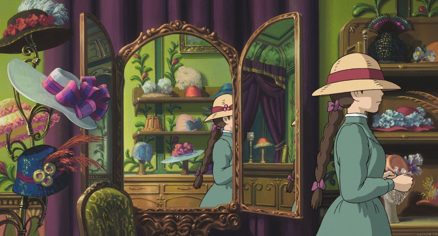 她是很开心的带着帽子欣赏自己,不过她很自卑,她看了会镜子里的自己很快就否定了自己,还有就是妹妹告诉她要注意不要被哈尔夺走了心脏,而她的第一反映是“没关系的,哈尔从来都只找美女”。