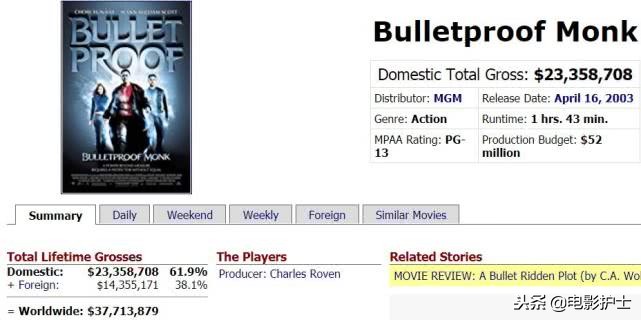 周润发在好莱坞也曾经辉煌过,他主演的华语大片《卧虎藏龙》北美轰出1.28亿美元,至今还保持华语片历史票房纪录。不过其他西片票房成绩就有点无奈了,说他是“票房毒药”也不为过,每部作品的票房都扑街,比如这部《防弹武僧》就怒亏了3个亿。这里面还有一个小插曲,这个题材本来是李连杰要拍的,但后来被周润发“抢拍”了,所以李连杰的版本就泡汤了。