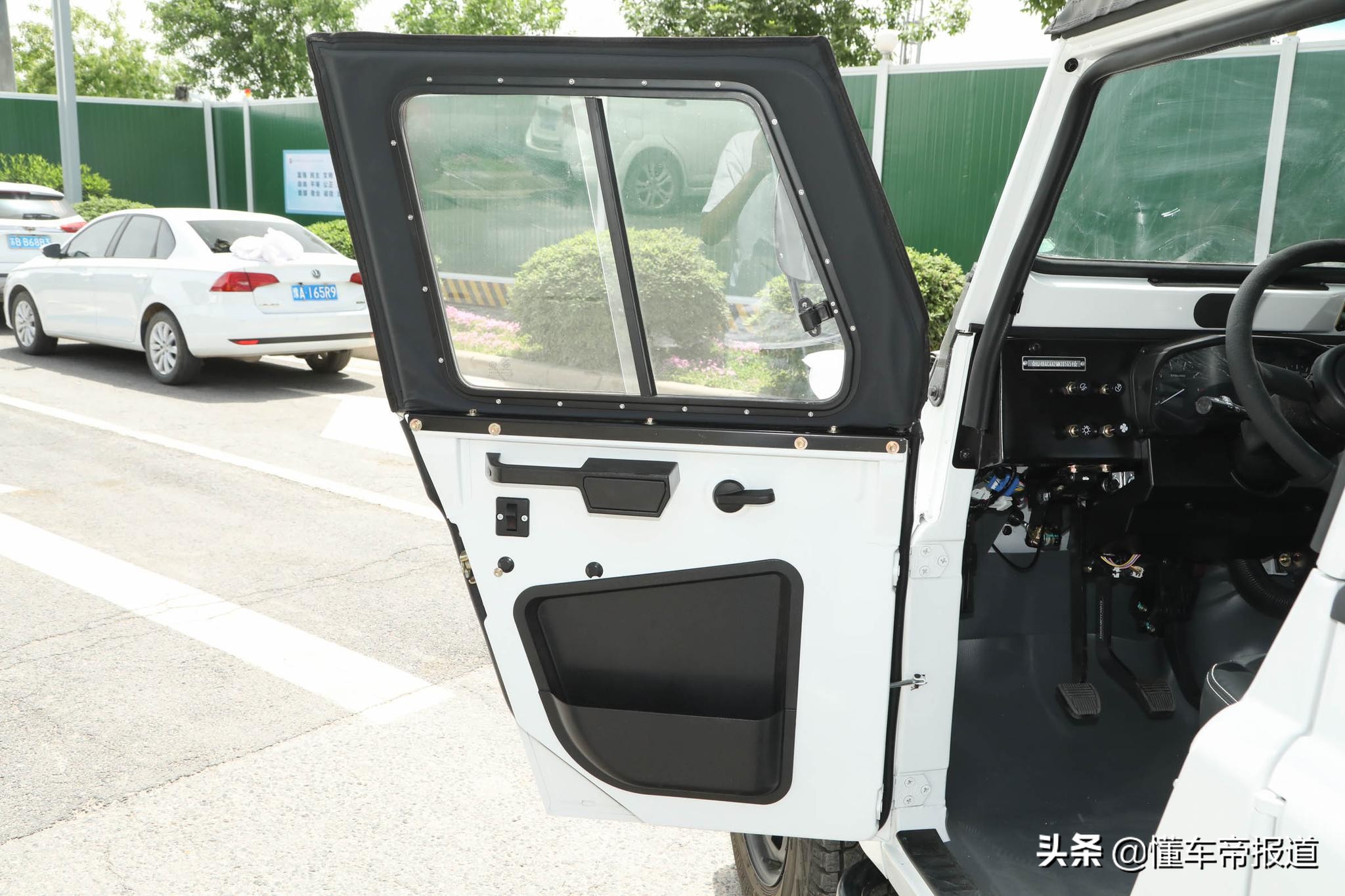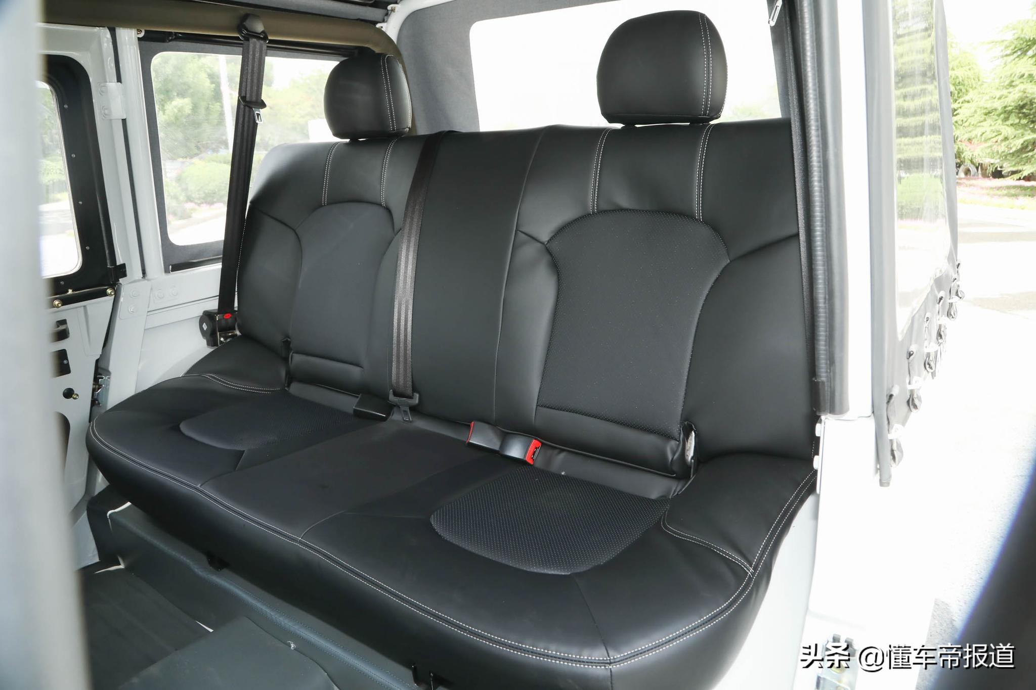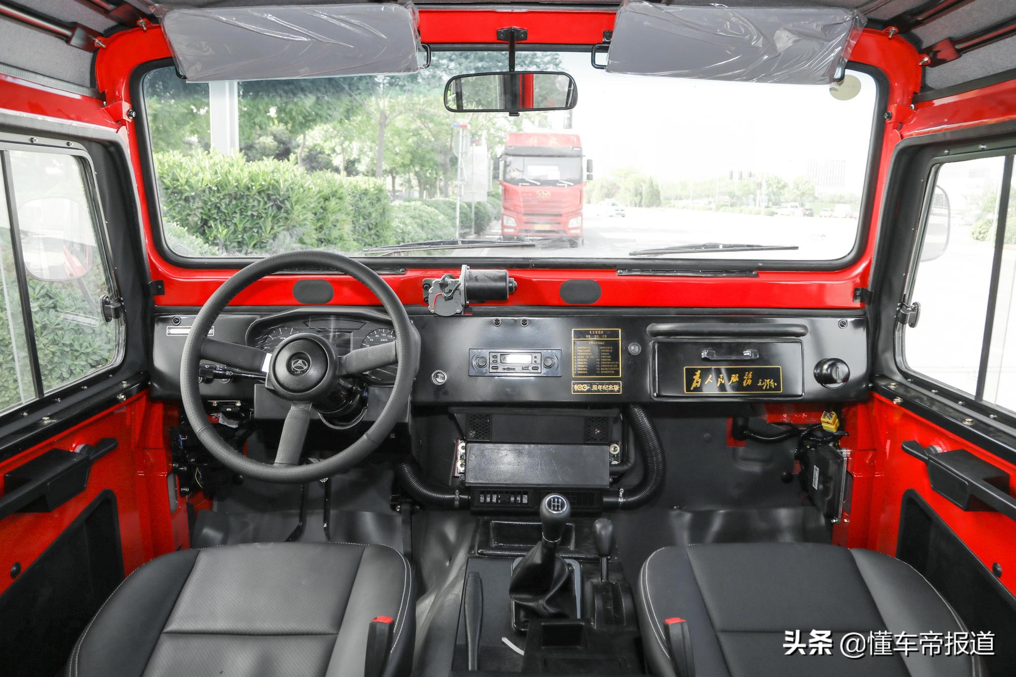 延续老款bj 212车内设计,新车内饰并非时下车型的整体包覆式处理,因此可看到与外观同色的诸多车身结构件,包括前挡风车窗边框、a柱、门板甚至前部防火墙。