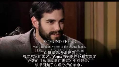 让我们回到直到刚才只被轻微提到的弗洛伊德,本作中最耀眼的配角,他从出场甚至就有一丝喧宾夺主的华丽感。原因可能是因为他的名声,或是原作者对于精神分析奠基人的尊重,为了突出还专门在开头安排了一幕,把西格蒙特称作弗洛伊德教授。