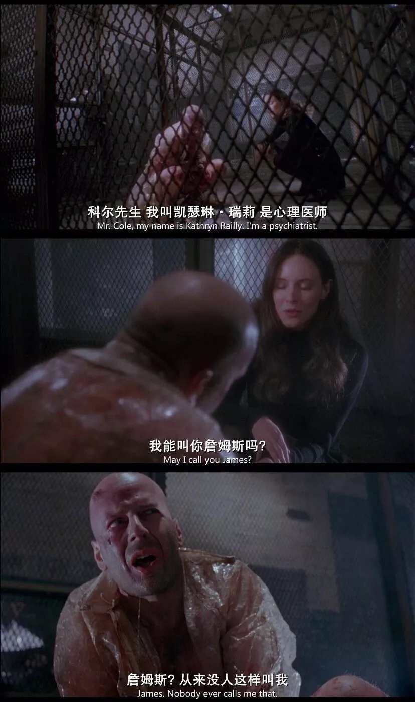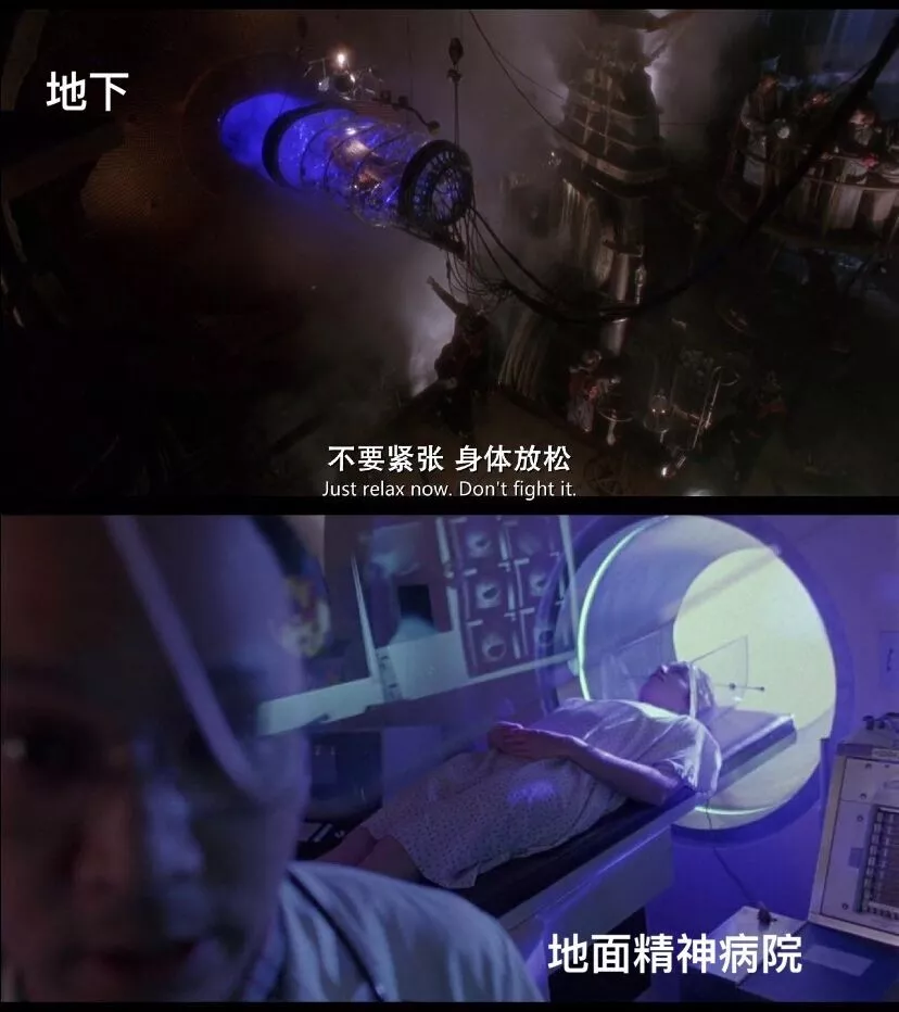 2035年科尔到地面搜集标本后回去时的消毒沐浴——1990年进精神病院时的消毒沐浴;