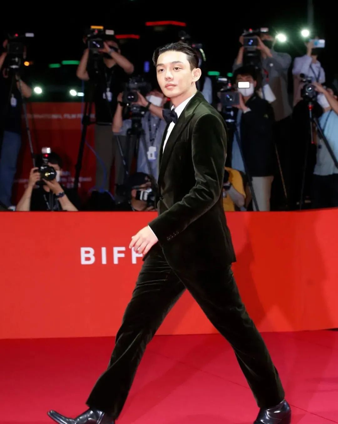 他也和宋仲基一样,选择了丝绒材质的西装,颜色上选用的是深绿色,而且也加了一个俏皮的领结,整个人的气场一看就是老电影人了。