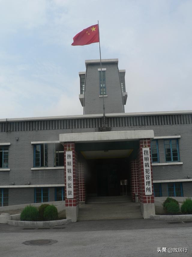 进了大门,迎面是一座两层灰色小楼。门口一侧写到"抚顺战犯管理所",另一侧写到"抚顺战犯监狱",正上方飘扬着一面五星红旗。