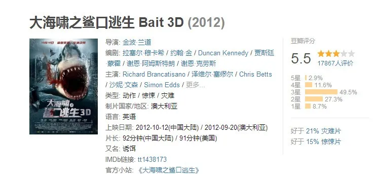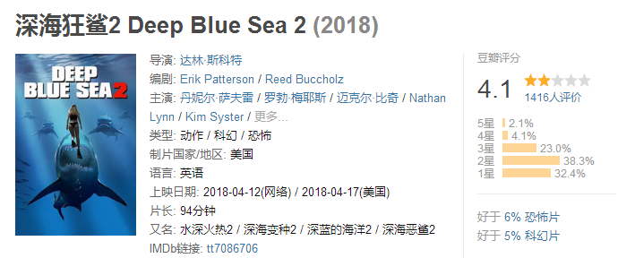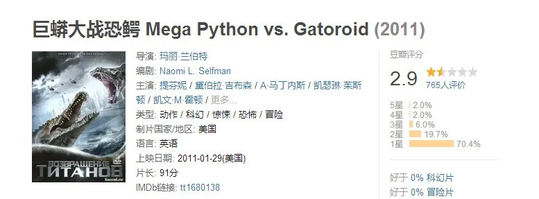 接下来。为大家梳理一些爬行动物的灾难片,首当其冲的就是狂蟒之灾系列,非常经典,但是豆瓣平台一般对灾难性影片打分较低,所以请忽略下分数,不过按照我看过的经验和结合豆瓣的打分,4分以下的灾难片还是可以不用看的,特技或者剧情都是被吐槽的点。爬行动物的灾难片以蟒蛇和鳄鱼为主