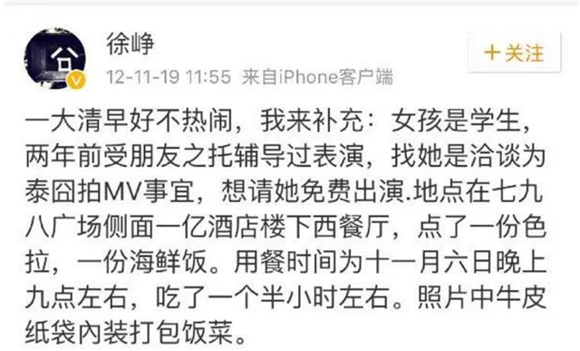2012年11月,卓伟爆料徐峥在街上搂着神秘女,酒店共度三小时。不过徐峥回应,女孩是学生,想邀请她参演电影,当时吃饭就花了一个半小时,随行还有6个人,酒店共度三小时不是事实。