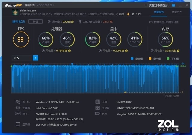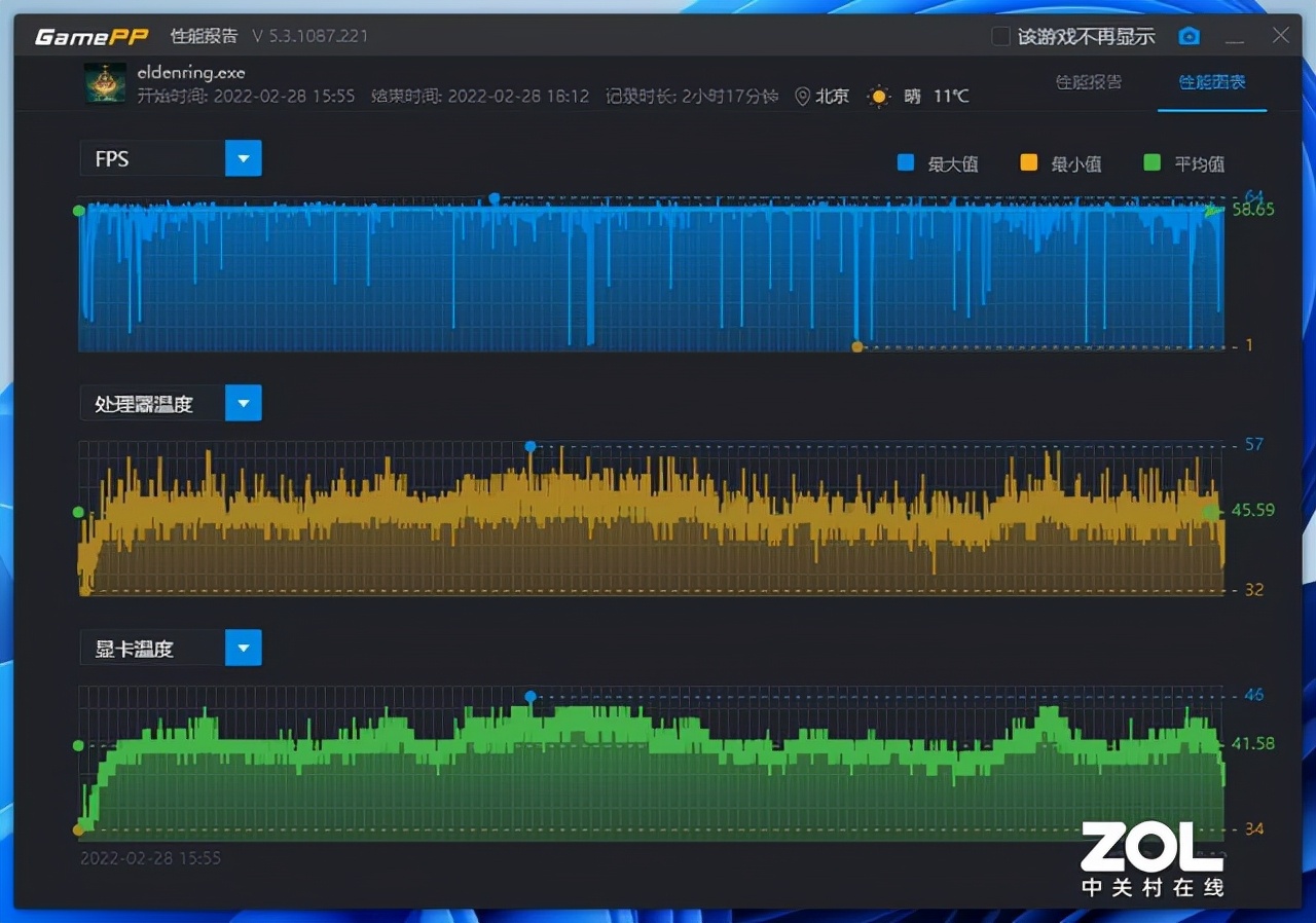 在这个两个多小时的游戏中,游戏的平均帧数为59帧,从帧数的波动图中可以看到一些一瞬之间的掉帧,那些就是前文说过的当穿过某些特定区域时会由于游戏本身优化问题而出现的掉帧,总体的游戏体验还是相当流畅的。