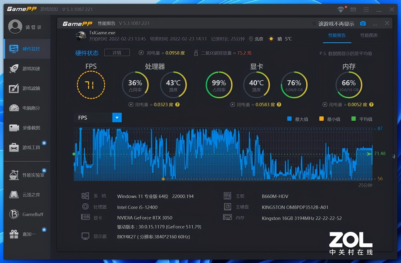 还值得一提的是cpu和显卡的温度,在游戏时室温在25~26度左右,这台机械师未来战舰ii代在散热方面并没有做的相当华丽,但是却非常有效,四面大面积通风口、四铜管cpu散热、机箱后方的风扇再加上i5-12400、rtx 3050本身温度不高,在两个多小时的游戏中,cpu和显卡的温度都只要40多度,保持的相当之低了。