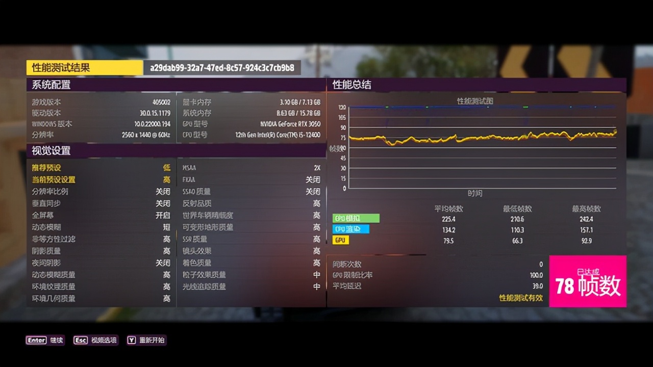 在《地平线5》中,2k分辨率+预设高画质,运行游戏内置的benchmark,平均帧数为78帧。