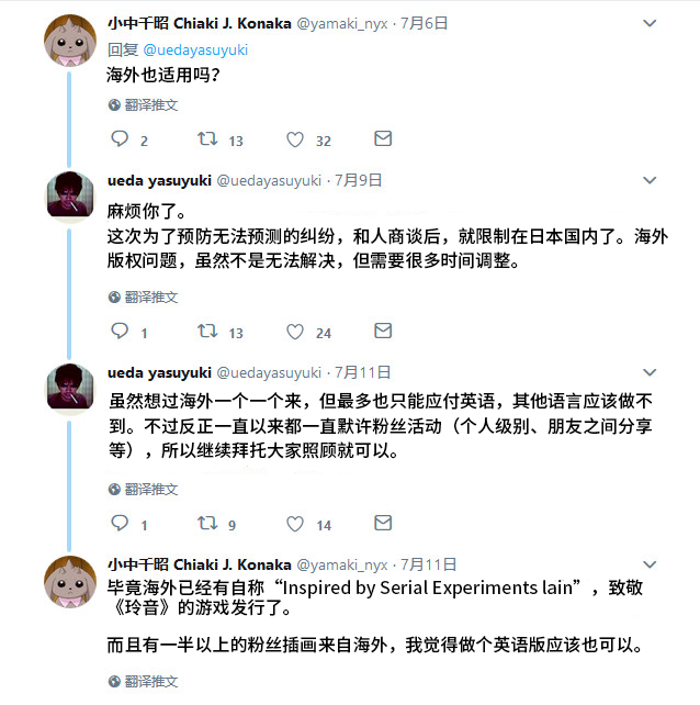 然而参考《玲音》开源计划执行人“大安吉日”,与脚本作者“小中千昭”在推特上的对话。可以看出就算海外,《玲音》官方管得也没那么严。