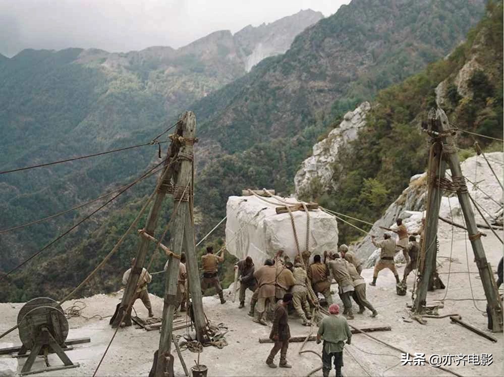 电影不禁让我想到《永恒之门》,就如同那句:“艺术不会在安逸之中诞生。”一位伟大艺术家毕生追求艺术的纯粹,却不断被人间杂事给影响阻挡的无奈,便是《罪恶》整部电影所聚焦的主题。米开朗基罗了建造陵墓而到卡拉拉开采“庞然大物”的巨型大理石,费尽心思设计出将石块运下山的办法,却在搬运途中因为铁钩偷工减料而导致其中一名工人惨死,不仅找铁匠理论时发现他早已在家中身亡,最后连石块也被扣押。或许跟他看待艺术态度与绝妙的创作天赋不相配的人性与世界,就是米开朗基罗的“罪”。