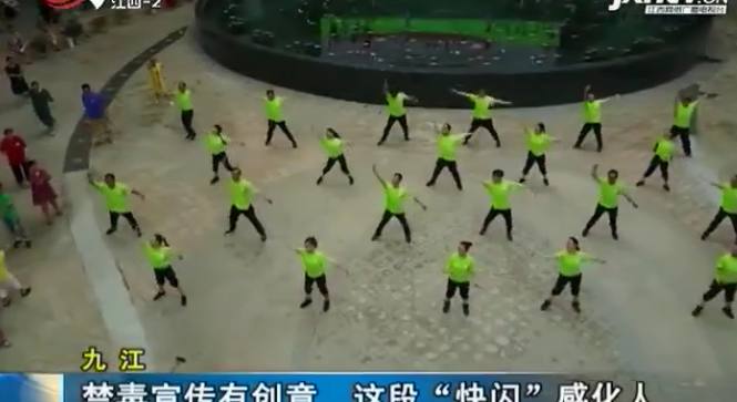 九江市公安局副局长 李盛勋:“开始是社会比较和谐的一个场面,美好的风景,壮丽的河山,特别是居民休闲的生活,练舞的,唱歌的,晨练的,突然来一个不和谐的场面,使大家惊醒,这就是吸毒造成的场面。这两个场面形成鲜明的反差来认识,来对比吸毒的危害。”