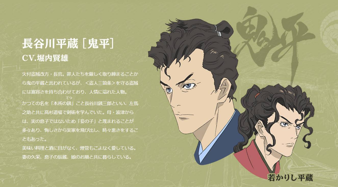 本作主角,在盗贼中有着“鬼之平藏”之名的火付盗贼改方·长谷川平藏。火付盗贼改方,特别警察者也,负责维护江户治安,取缔各种犯罪活动。平藏其人,既是对待犯人毫不容情的铁血捕头,又是有着似水柔情的男儿。