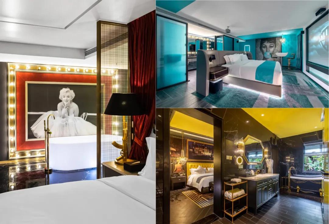 以与电影深度跨界的深圳殿影酒店为例,内设“过把明星瘾”的场景布置,走廊以星光大道的形式展现,营造一种浓浓的明星体验感。进入房间就好像进入了电影场景中,房间的每一处设计和装饰都极具代入感。且观影配置堪比影院,133寸大幕+1080p高清投影+5.1环绕立体音响,还有明星化妆台、网红发光浴缸、五星床品、智能客控……搭配窗外山海视野,目之所及均与电影有关。