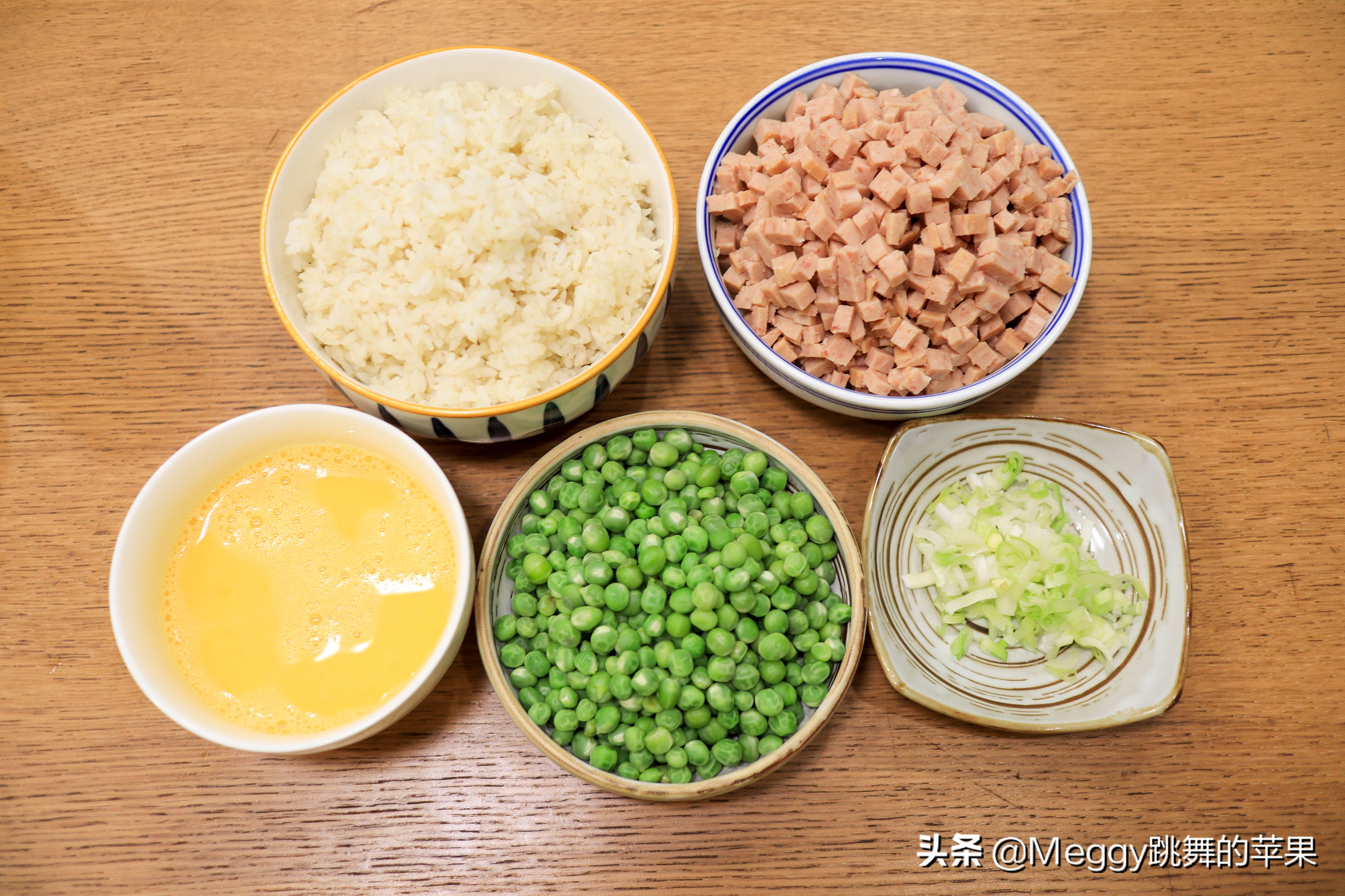 1 隔夜剩米饭,午餐肉切小丁,鸡蛋打散,豌豆焯熟,少许葱花;