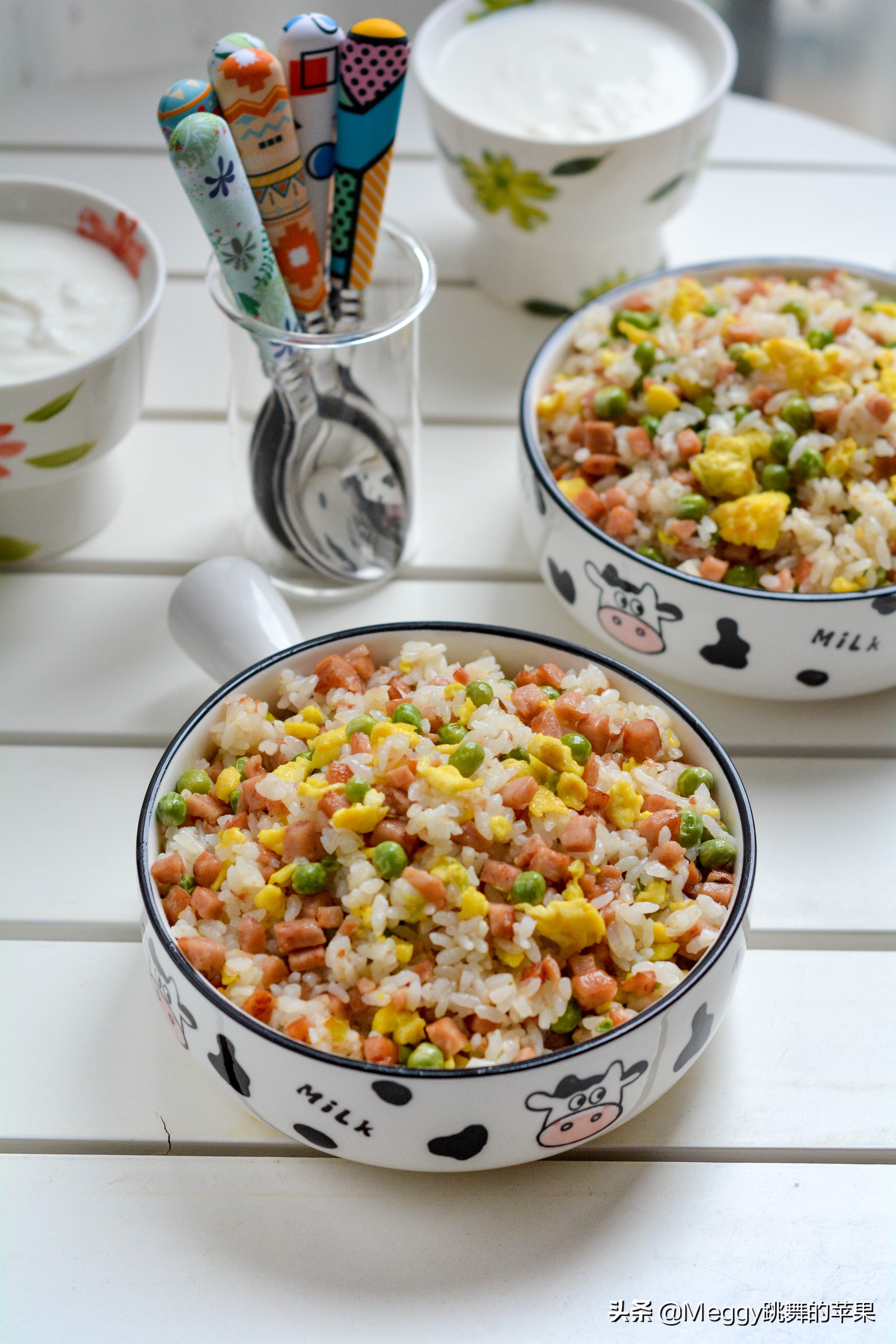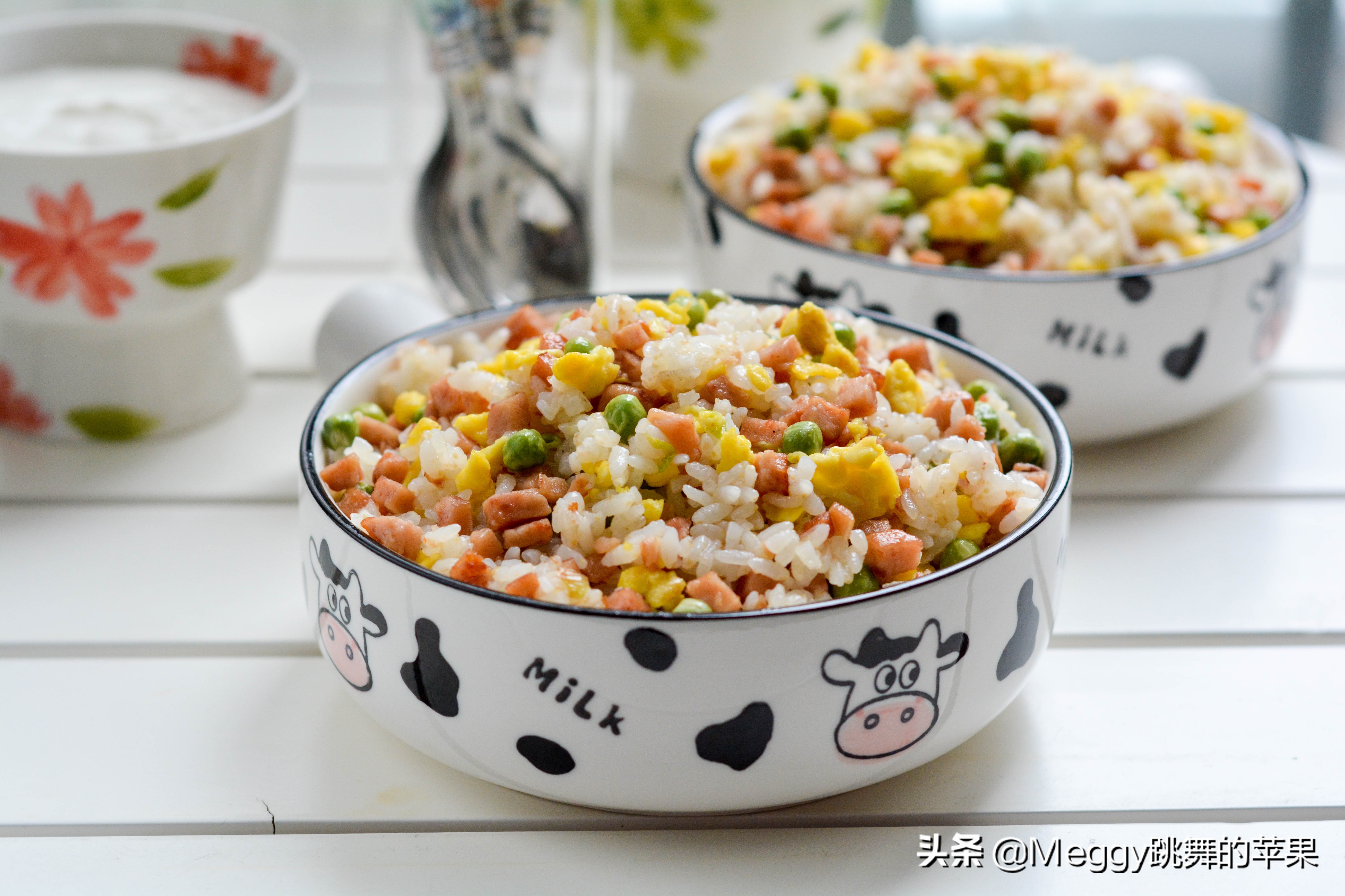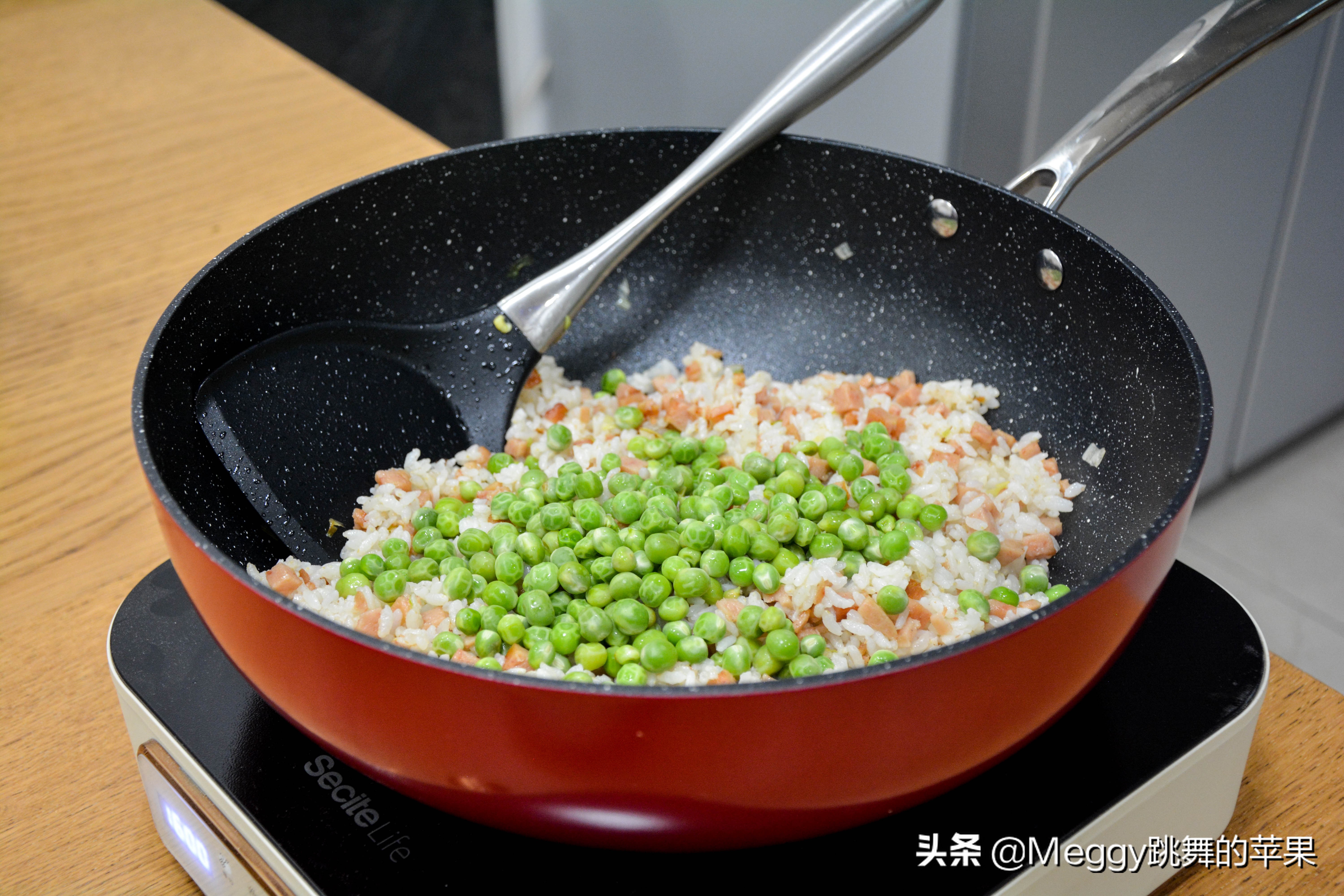 解决剩米饭的最佳方法,除了煮稀饭,蛋炒饭是最常见的。我又往里放了一盒午餐肉,一碗豌豆,这黄白绿粉的搭配,真真儿是热闹非凡。