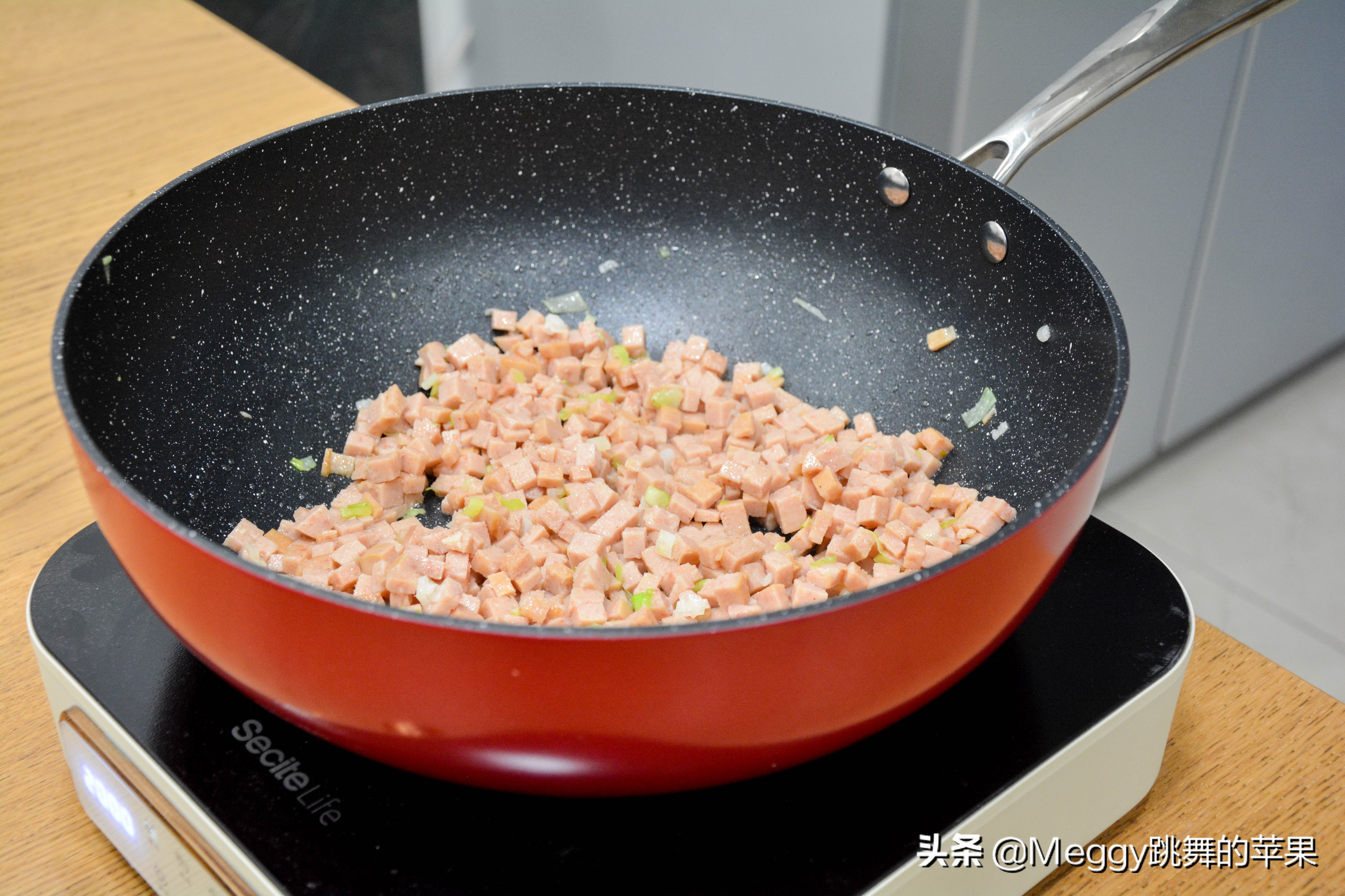 3 少许油,葱花炝锅,倒午餐肉炒3分钟,表面微焦定型;
