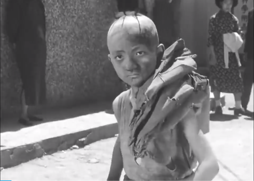 有意思的是,韦廉也曾在《三毛流浪记》里客串过,就是这个面色忧郁的小男孩,此时他正坐在三毛努力推动的人力车上。
