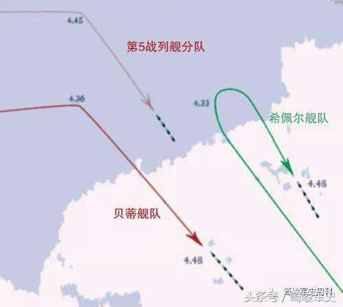 05:00 杰里科命令战列舰本队以16节航速转向南偏东50度与贝蒂会合。