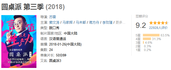 物欲横流的当今时代,各种电视综艺、网络综艺节目鱼龙曼衍——有明星夫妻秀恩爱的,有以热辣鲜肉博流量的,还有制造话题引起争议的。说起文化类节目,应该是属于综艺节目中"不讨好类型"的。但是,偏偏有这样一档文化节目从2016年到2019年连续三季在豆瓣高分榜上居高不下,这就是由"文化名嘴"窦文涛携手优酷推出的具有"窦氏风格"的聊天真人秀节目——《圆桌派》。