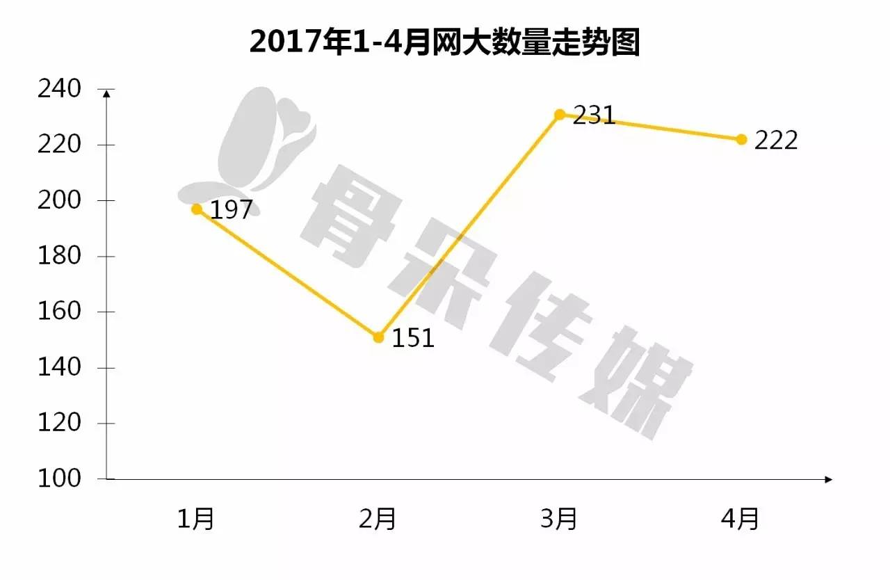 2017年4月,网大数量较3月减少9部,环比下降3.9% 。