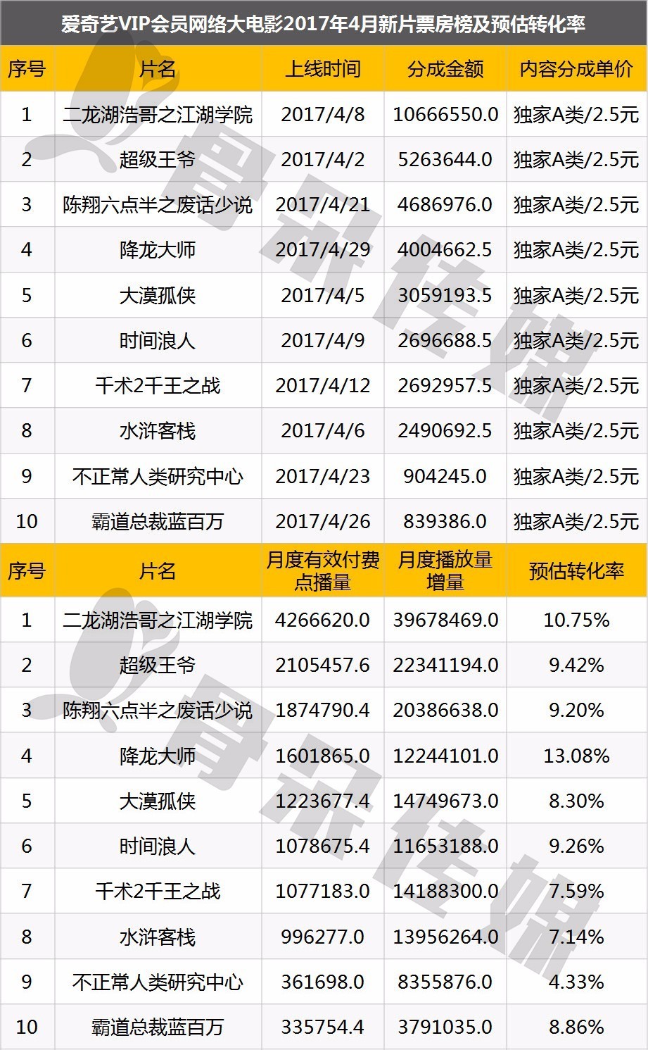 爱奇艺vip会员网络大电影2017年4月票房榜及预估转化率
