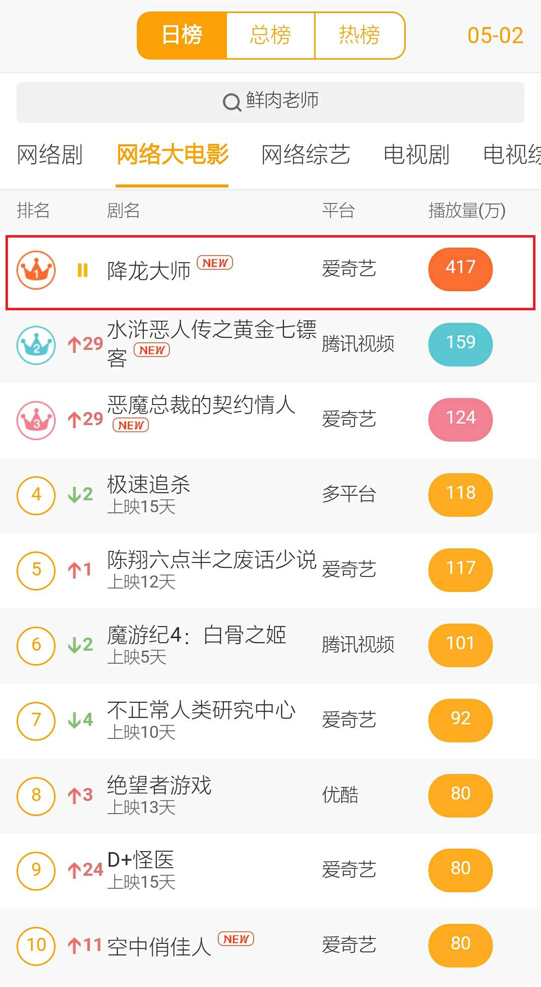 4月,爱奇艺独播网大《降龙大师》以943.9万的首日播放量排名第一