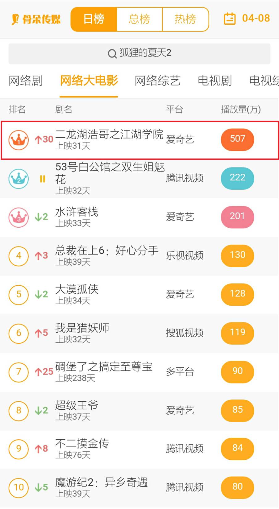 4月首日播放量top10中,爱奇艺占据七席,腾讯视频占据三席;