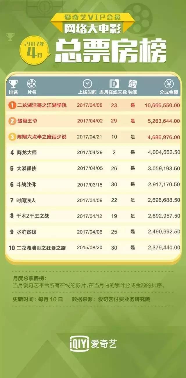 2017年4月,《二龙湖浩哥之江湖学院》以1066.7万的分成金额荣登爱奇艺vip会员网络大电影2017年4月总票房榜榜首;3月榜首《斗战胜佛》在本月成绩不俗,排名总票房榜第六。