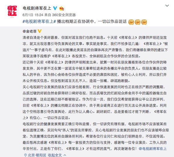 虽说制作方一纸声明回应了所有事情,但关于被退片的传言并未消失,制作人金屹菲再次发博表示:清者自清;造谣一张嘴,辟谣跑断腿。以此来证明《将军在上》从未有退片一说。