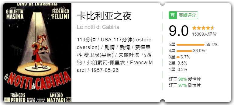 今天给大家推荐的电影《卡比利亚之夜》讲的就是一个相信的故事。卡比利亚是一个站街女,但是她却一直都相信美好的爱情会在自己身上发生。理想归理想,现实中却很矛盾。她不断地邂逅一个又一个男人,又不断地因为各种原因被抛弃。时间在交替,卡比利亚的生活却变得越来越糟糕,但是唯一不变的却是她对于美好生活的追求。