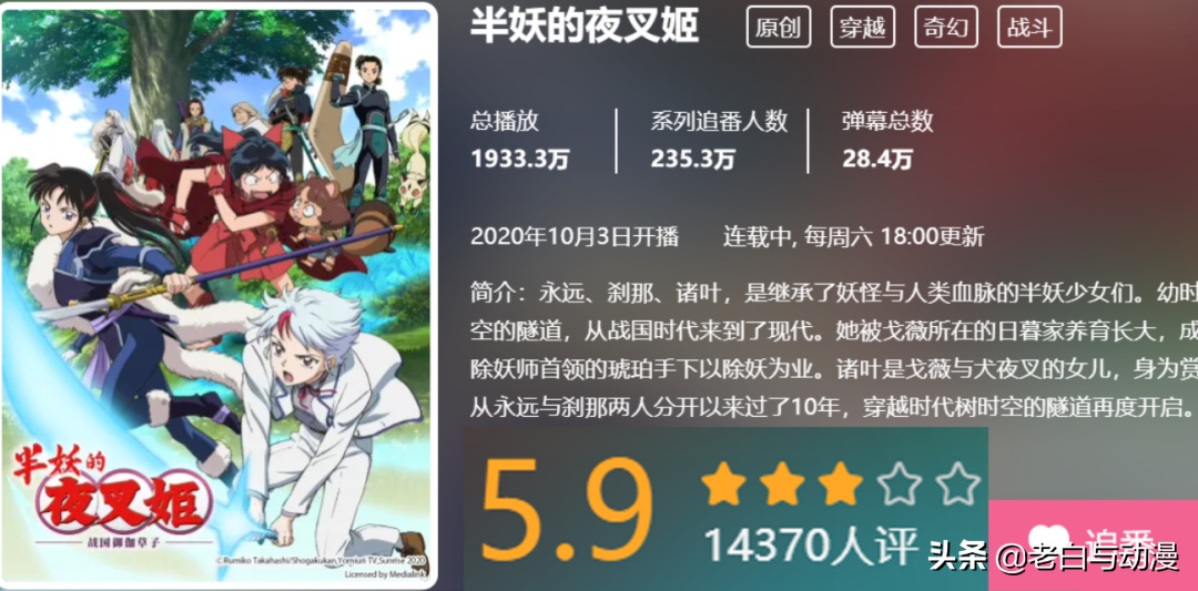 再来则是熟悉的《犬夜叉》次世代动画《半妖的夜叉姬》,评分为5.9分,夜叉姬的制作一般般,剧情很普通,而大家之所以追它,正是因为《犬夜叉》里的人物;