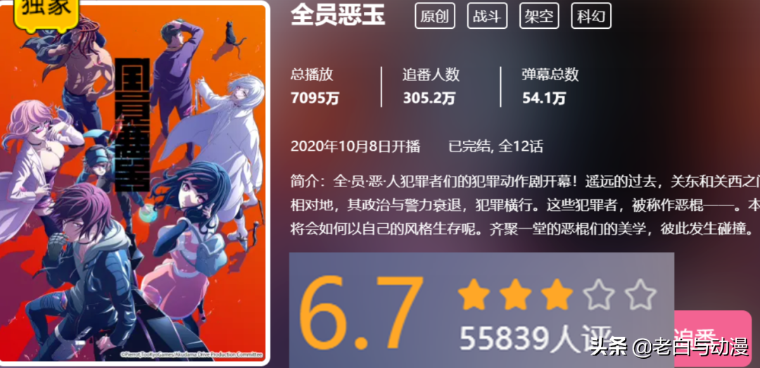 紧接着是《全员恶玉》,评分6.7分,这是一部高开低走的动画,前期吹爆,主角们很放飞自我,而后期剧情逐渐拉跨,很多坑都填就这么直接完结!