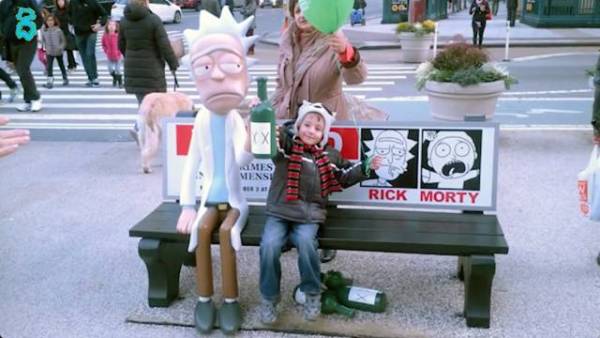 8、adult swim在《瑞克和莫蒂》第一季时就下足了市场宣传的功夫。在2013年12月,纽约的市民也许都注意到了街灯柱上有《瑞克和莫蒂》中的飞船的售卖广告,如果你去到百老汇大道,你还会看见瑞克的飞船坠落在纽约第一摩天大楼——熨斗大厦前方,莫蒂就坐在飞船里面,而瑞克则在一旁的长椅上喝酒。