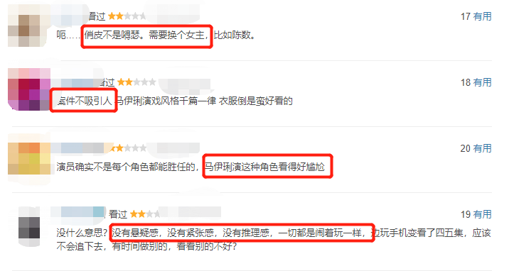 虽说服化道具方面十分精美,但观众对于一部电视剧考量更在于剧情的精彩和演技的出彩。有网友看完这部剧后表示道:该剧没有悬疑感、紧张感、推理感,案件不够吸引人。更有网友质疑马伊琍并不适合出演"苏雯丽"一角。