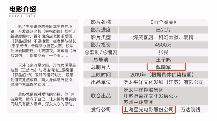 据猫眼数据显示《画个圈圈》发行单位除了知名的万达院线,还有上海星光传媒集团,本片的制作人同样也是该片的发行单位的上海星光集团董事的戴晓军更是为了该片的上映拍片提供了绝对的优势。