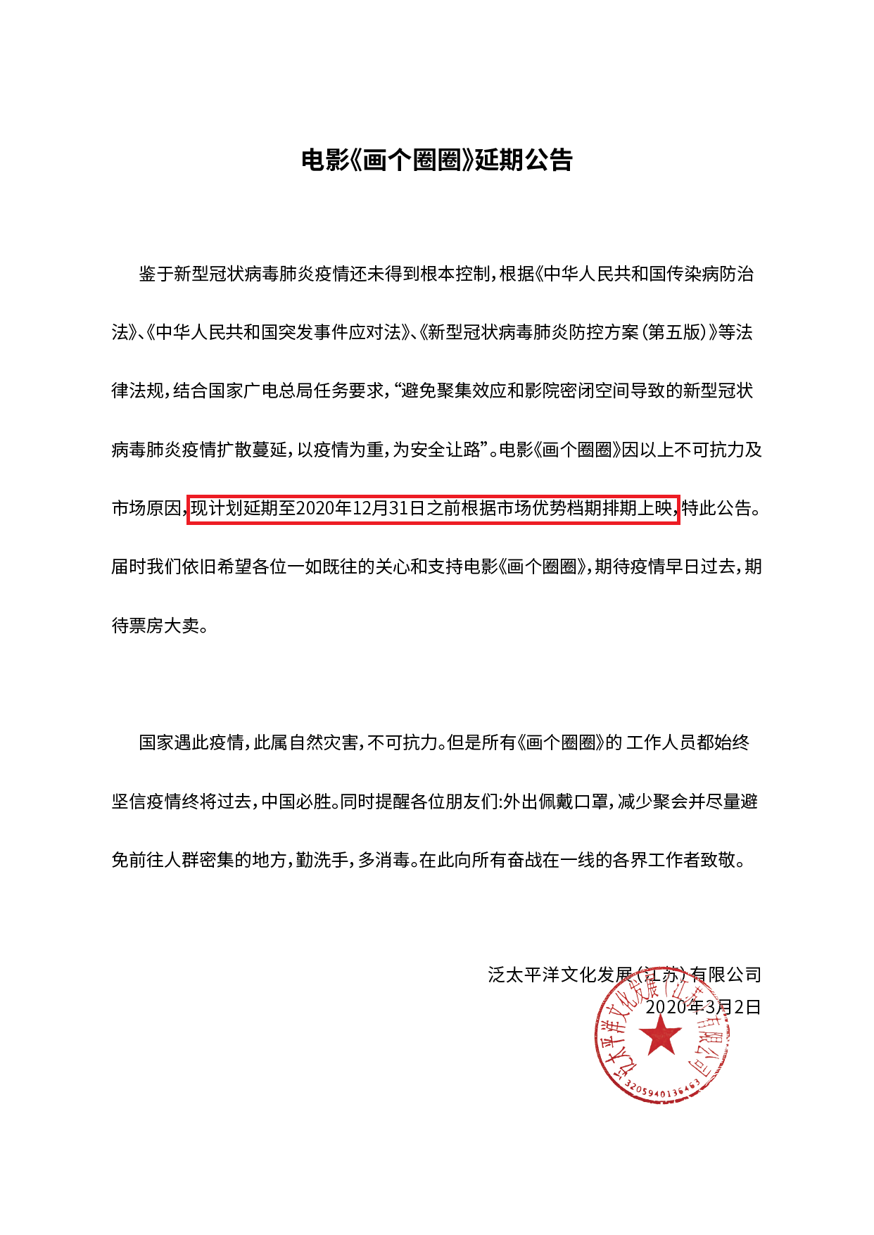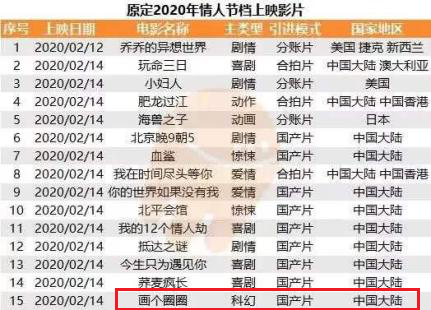 因疫情影响原本在2020年2月14号的情人节上映的电影《画个圈圈》,何时才能上映呢?据《画个圈圈》发布的延期的公告来看,计划延期至2020年12月31日之前根据市场优势档期排期上映。