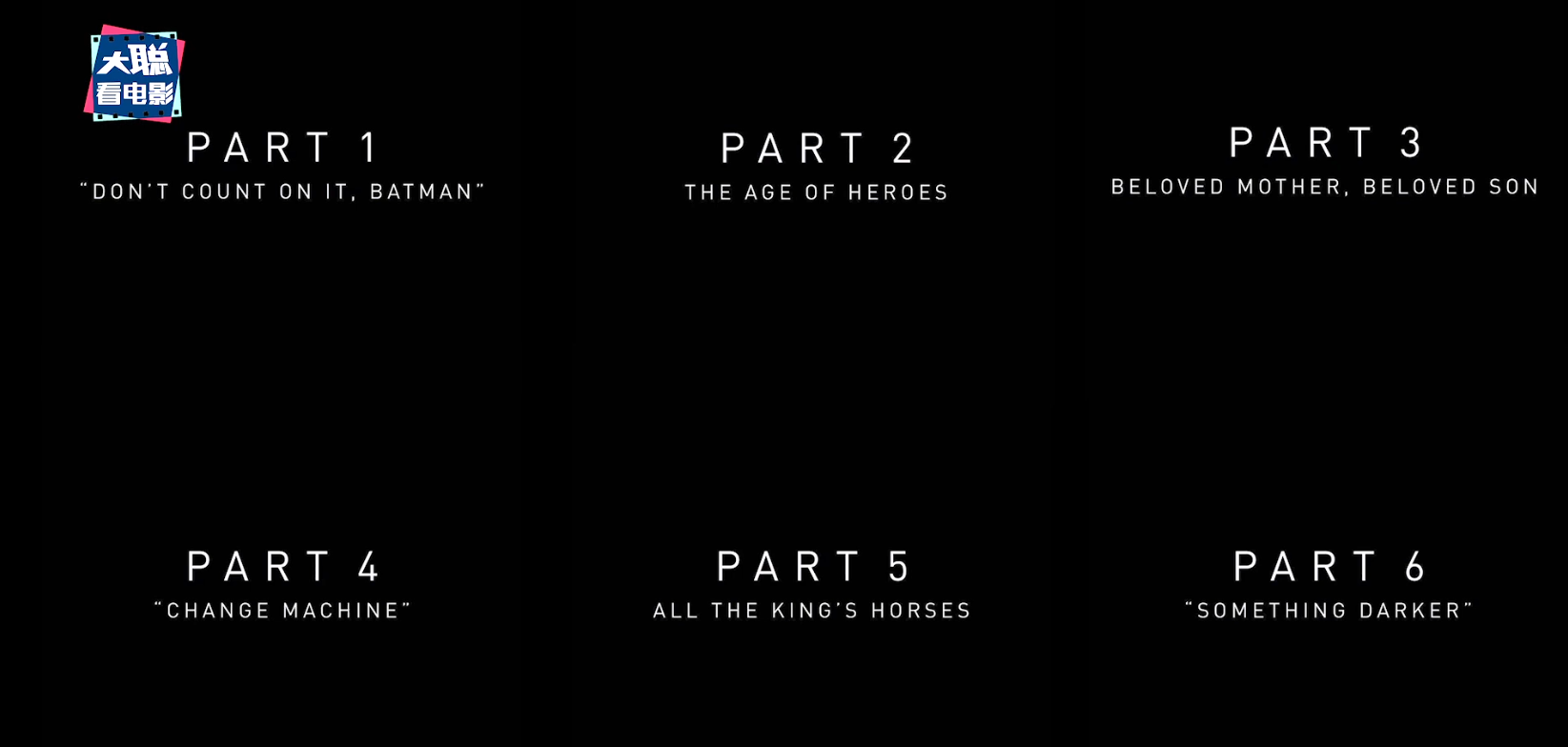 这6个章节分别是1《别指望它,蝙蝠侠》,2《英雄时代》,3《亲爱的母亲,亲爱的儿子》,4《改进的机器》,5《国王班底》,6《更黑暗的存在》。