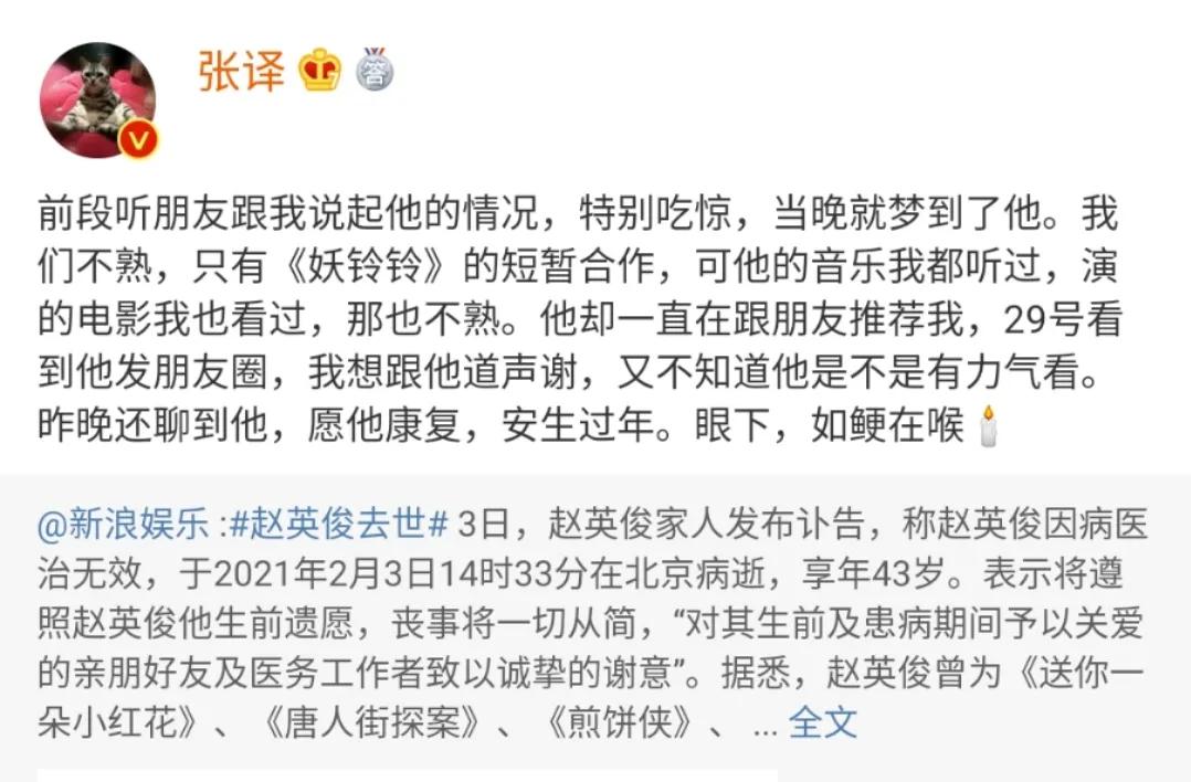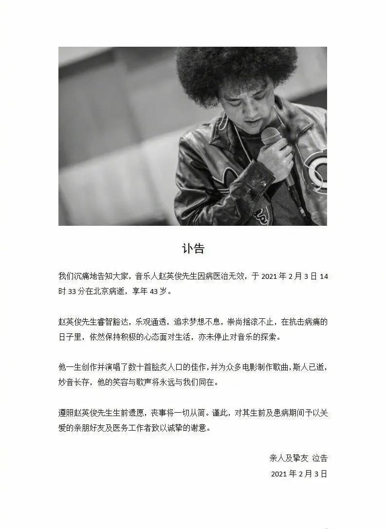 2021年2月3日,音乐人赵英俊所在经纪公司发文,称其于当日因病医治无效,不幸离世,享年43岁。