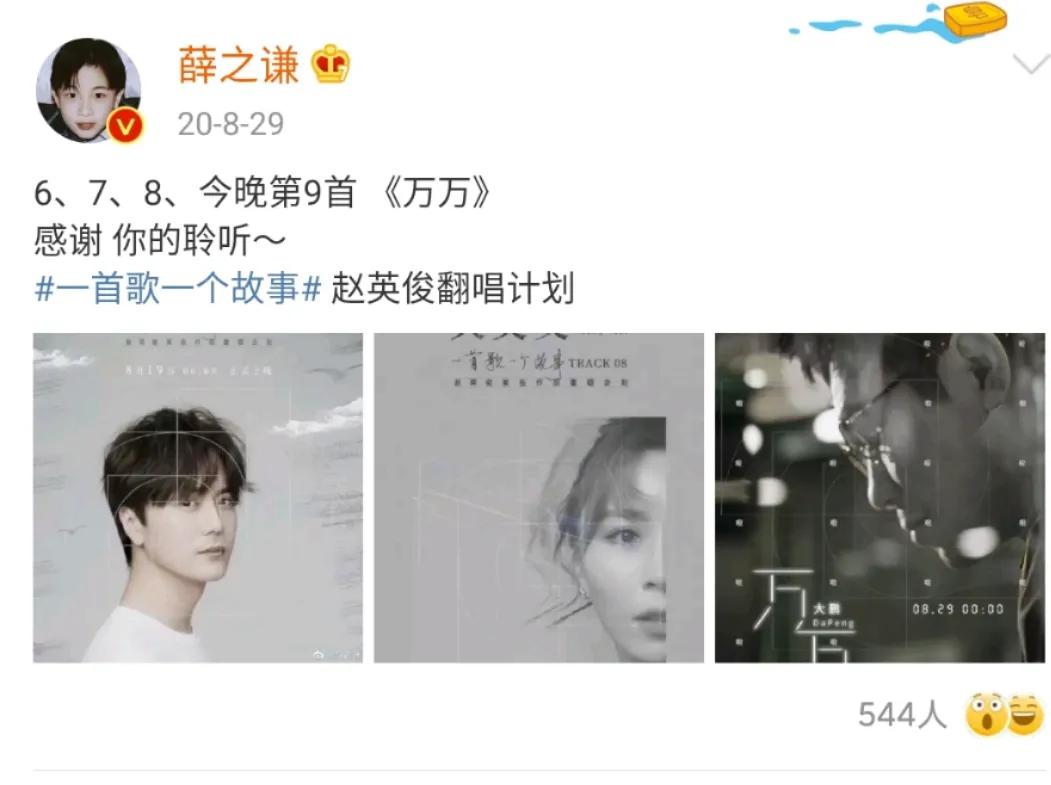其实就在去年,歌手薛之谦就在社交平台上发起了赵英俊部分歌曲翻唱计划,邀请了一众著名歌手韩红、陈奕迅、张杰、王源等翻唱了赵英俊的共计13首歌曲。