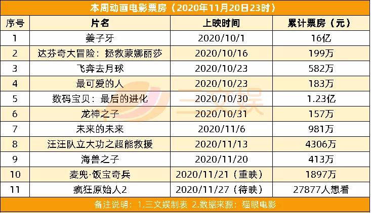动画电影方面,截至11月20日23时,《姜子牙》累计票房达16亿元。11月20日22时,猫眼发布电影最终票房预估为15.99亿元。