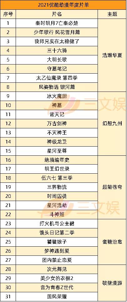 优酷方面,在11月20日公布了2021优酷动漫年度片单——将有31部动画作品将与观众见面,包括《秦时明月 亡秦必楚》《少年歌行 风花雪月篇》《三十六骑》《冰火魔厨》等。既有原创作品,顶级ip的动画化作品,也有主打新国风的作品。