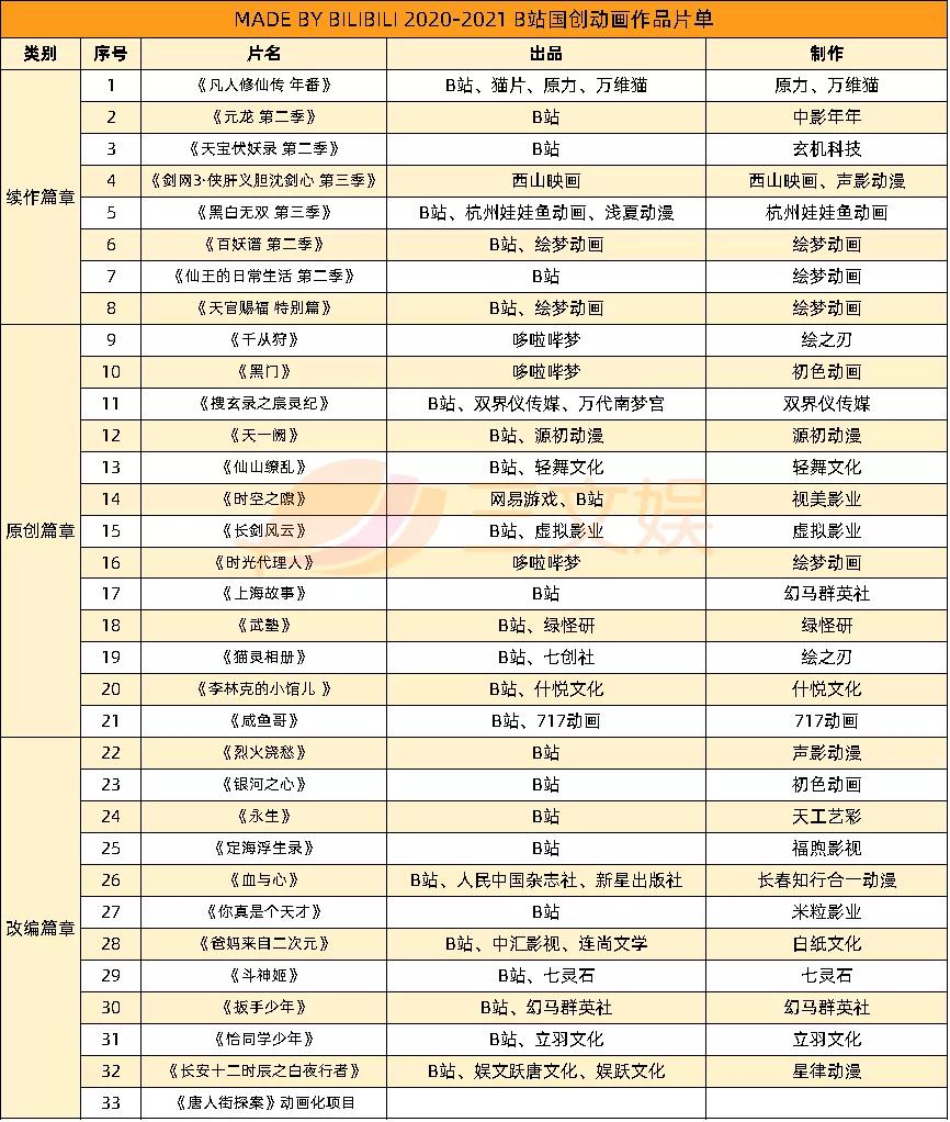 b站方面,11月21日哔哩哔哩(以下简称“b站”)在2020-2021国创动画作品发布会(以下简称“国创大会”),公布了33个动画剧集项目的新进度,及已布局的4部国产动画电影。