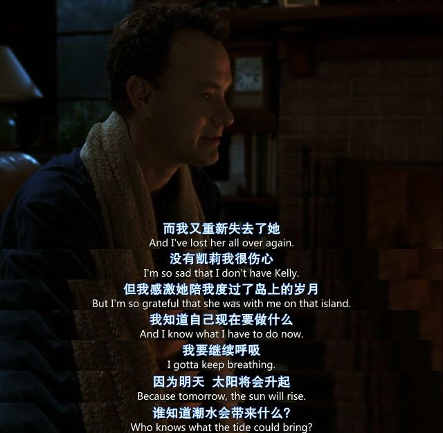 而被困在孤岛上的查克,变得很悠闲,他什么都没有了,除了时间,曾经为之匆匆忙忙,现在他再也不用为工作操心了,望着大海发呆。
