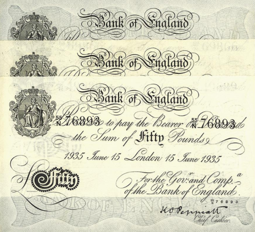 战前英镑的设计巧妙且精致,仅不列颠尼亚的图案都是经过了特别的设计,连水印工艺都是精湛非凡。纸张选用的是十字形交叉亚麻纸,数字编号也是严谨周全的。所以,在一九四五年之前,英国纸币堪称完美,也几乎无人可以防制。