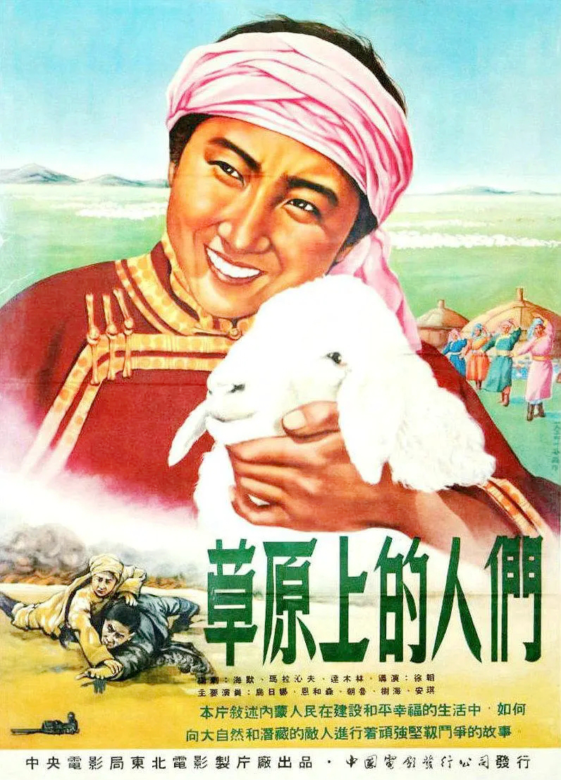 《草原上的人们》由东北电影制片厂拍摄,徐韬导演,乌日娜、恩和森主演,1953年上映,描写了内蒙古草原牧民与潜藏的敌特分子展开斗争的故事。